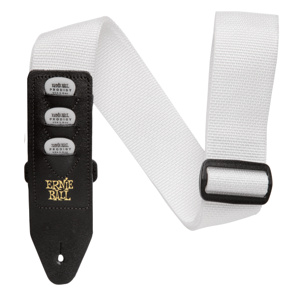 The Pickholder polypro guitar strap is designed with an extended leather end to conveniently house up to three guitar picks on the lower front end of the strap. The leather ends are embroidered on comfortable 2� wide polypropylene webbing, providing added durability and strength. Strap length is fully adjustable for short or extra long applications. Overall strap measures 41 inches to 72 inches long.