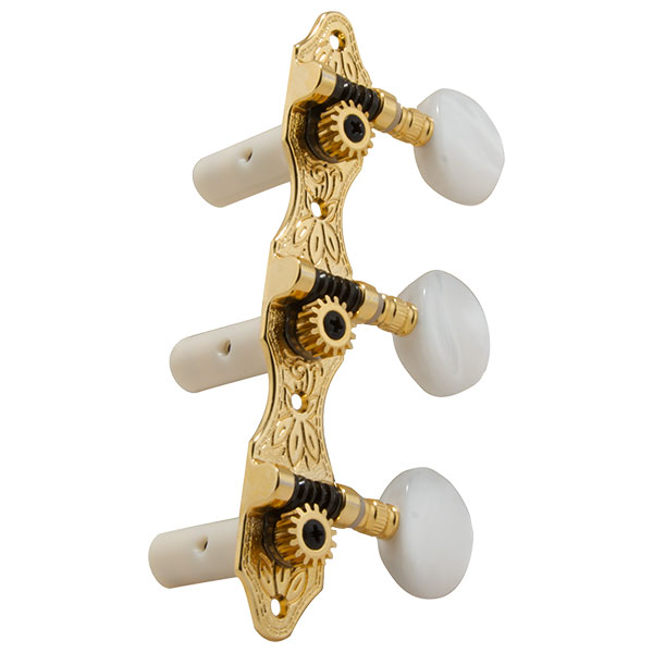 Excellence in materials and craftsmanship are the hallmark features of these classic machine heads. The die cast base provides a rigid foundation for the gear and worm, assuring perfect alignment and mesh. The pearloid buttons are attached with a tension screw to provide the feel of your preference. A bearing over the worm shaft provides additional support and enhances the smooth performance. Includes wood screws. With a 14:1 gear ratio.